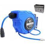 エアーホースリールは自動巻取式で、壁掛けや天吊りに対応。180°回転ブラケット付きで便利。10/15/20/25mの長さで、5*8*10mのPU管と空気銃付き。