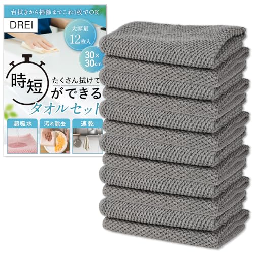 速乾性と吸水性に優れたキッチンタオル。12枚入りの柔らかマイクロファイバー製で、食器拭きや台所の布巾に最適。グレーのシンプルなデザインで、使い勝手も良好です。
