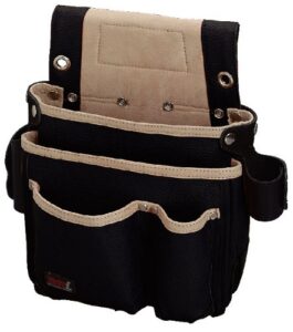 ブラック×ブルーの腰道具、工具差し腹袋、ベルトループ対応で着脱が容易です。耐久性があり、カスタムチェーンで便利に工夫されたデザインが特徴。作業効率を高めるアイテムです。