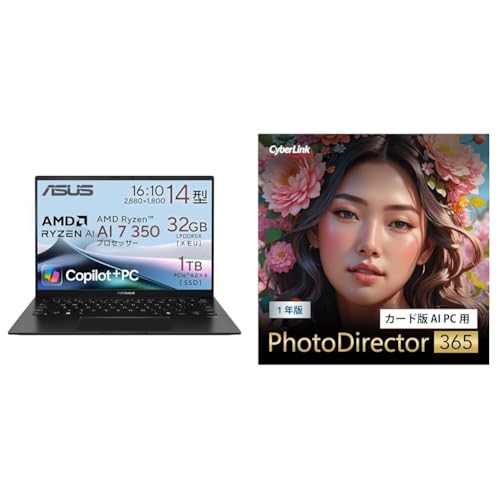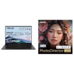セット買いのASUS Zenbook 14 OLED UM3406KAは、Ryzen 7、32GBメモリ、1TB SSDを搭載。13.2時間のバッテリー持続、重量1.2kg、Type-C給電対応。写真編集ソフトPhotoDirector 365 1年版付き。