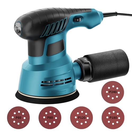 サンダー 電動ランダムオービットサンダーは、6段階調速で回転数6000-12000min-1。自動集塵機能付きで、125mmサンドペーパー(P240、P180、P120、P80、P60)を添付。木工作業や研磨に適し、日本語取扱説明書あり。