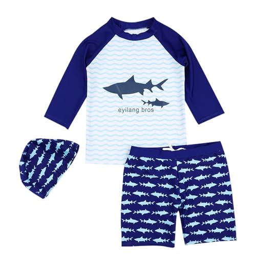 水着 男の子 3点セットは、赤ちゃんや子供向けのラッシュガード、UVカットのスイムウェアです。シャーク柄で、トップス、パンツ、キャップが含まれます。サイズは身長100cmのストライプデザインです。