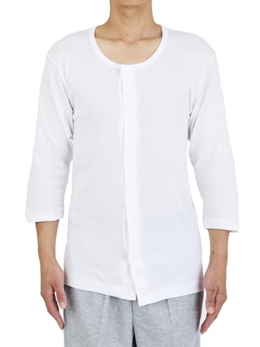 【2枚セット】介護肌着は、男性向けの七分袖前開きタイプです。ワンタッチテープで着脱が簡単、快適な着心地を提供します。抗菌防臭効果もあり、綿100%で肌にも優しい。サイズはLで、清潔感のある白色です。