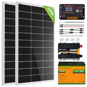 ECO-WORTHY 200W ソーラー発電キット:2枚 100W ソーラーパネル 単結晶+30A PWMチャージコントローラー+600W 12Vインバーター+50Ahリチウムイオンバッテリー リン*1個+ 2個Z字型 取付金具合 付属 耐蝕性 太陽光チャージ 省エネルギー 独立型 自作 家庭用 DIY 小型【Amazon限定ブランド】