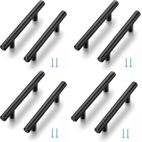8個入りのブラックのステンレス鋼製キャビネット取っ手。96mmサイズで、引き出しや食器棚に最適。ネジ付きで取り付けも簡単。シンプルで耐久性に優れたデザイン。