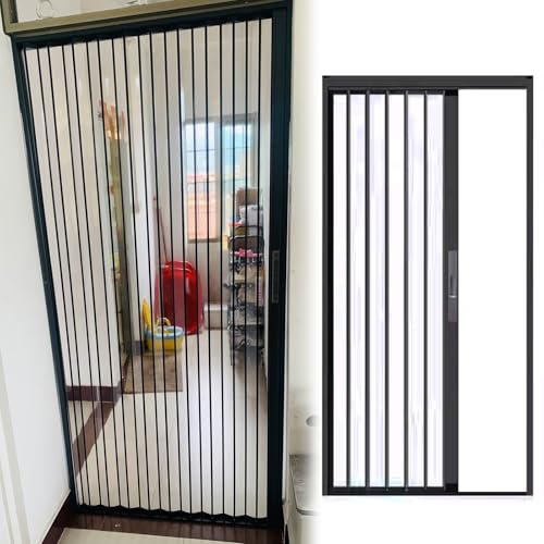 ブラックアコーディオン折りたたみドア。アクリルパネル採用で、キッチンやバスルーム、小部屋に最適。サイズはWxH 70cmx190cmのカスタム可、透明でスタイリッシュなデザイン。