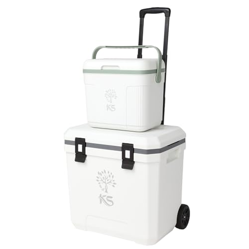KSクーラーボックスは36L(38QT)で、全6面が断熱設計。軽量でキャスター付きのため、部活やBBQ、アウトドア活動に最適。釣りやキャンプ、ゴルフ、防災にも便利なホワイトのセット商品です。