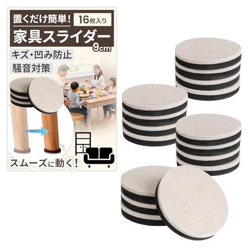 家具スライダーは、丸型のフェルト製で、キズ防止と凹み対策に最適です。静音設計で、大型家具や家電を簡単に移動できます。ベージュの16枚入り、直径9cmのシンプルで便利なグッズです。