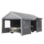 tangchengカーポートは、幅3m、長さ6m、高さ2.8mの大型テントで、防水仕様。車庫や倉庫、バイク・自転車の収納に最適。頑丈なスチールパイプ構造で、ドア付きの便利なデザインです。