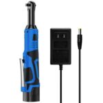 充電式ラチェットレンチ18V、最大トルク100N.m、コードレスで直角電動レンチとして多機能。バッテリー2個付き、LED作業灯、無段変速機能、負荷保護付き。車輌エンジン修理や現場改装、自転車作業に最適。