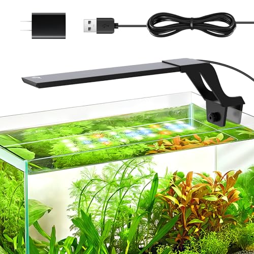 AQQA水槽ライトは、小型水槽用に設計されたタイマー付きLEDライトです。10段階の明るさ調整と3色切替が可能で、省エネ。16H自動調光モード搭載。USB給電、説明書付き。