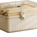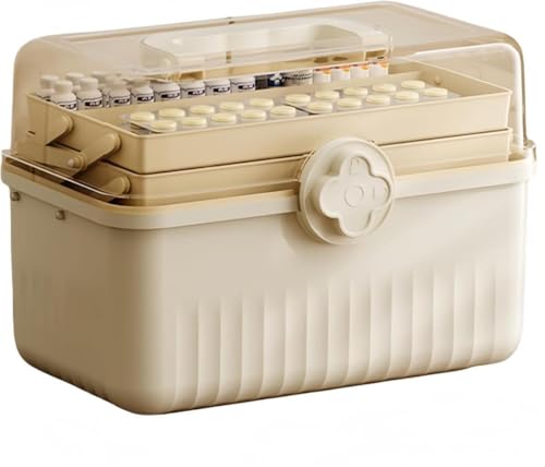 3層プラスチック仕切り収納ボックス。ハンドル付きで持ち運び簡単。大容量の救急箱や薬箱に最適。裁縫、メイクアップ、ネイル、子供用ヘアアクセサリーの収納に便利。サイズ: 39*23.1*20.8cm、クリームホワイト。