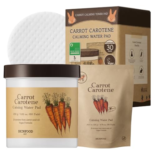 SKINFOODのキャロットカロテンカーミングウォーターパッドセットは、90枚入り(本品+詰め替え)。トナーパッドで、拭き取り化粧水として、肌の保湿や鎮静に効果的な韓国スキンケア製品です。