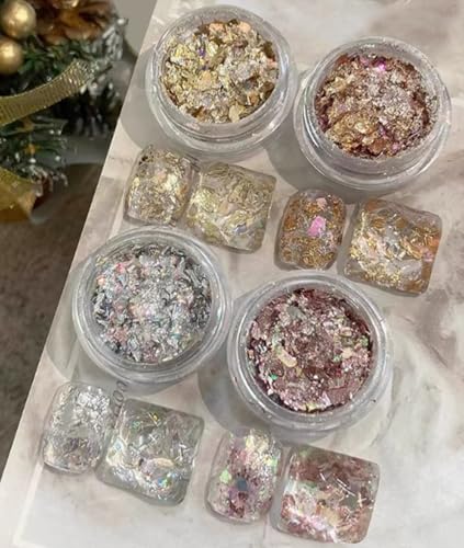 ゴールドリーフフレークは、ネイルアートやメイクアップに最適な装飾素材です。ペインティング用ホイルフレークも兼用でき、4個セットで多様なデザインが楽しめます。簡単に扱え、華やかさをプラスします。