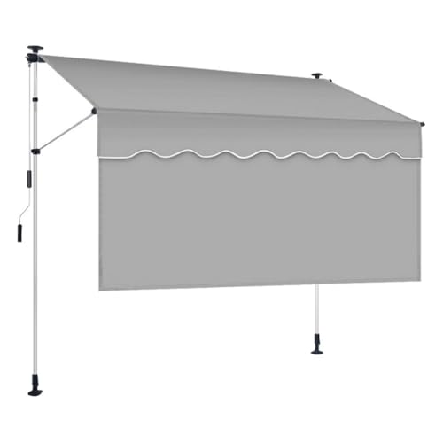 SOLLENTオーニングテントは、前幕付きで巻き取り式。UVカット、雨よけ機能に優れ、2M-3Mの高さ調整が可能。簡単設置でコンパクト収納、幅1.5mのライトグレー色。屋外使用に最適。