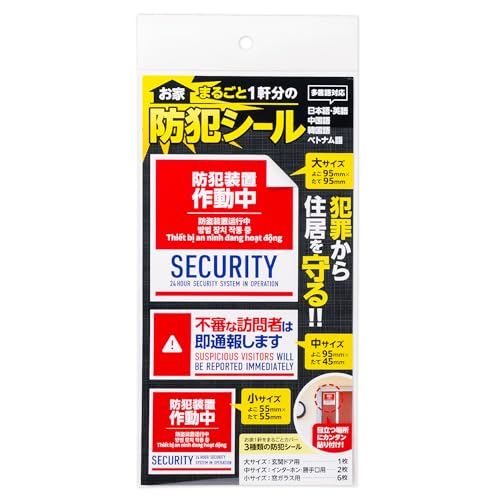 お家まるごと1軒分の防犯シール3種計9枚セットです。貼るだけの簡単なセキュリティ対策で、5ヶ国語に対応しており、サンカットラミネート仕様で耐久性もあります。
