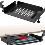 PhyiFlbeyのテーブル下収納ラックは、机の下に簡単に付けられるクランプ式で、スチール製。耐荷重5kg、放熱穴付きで、ノートPCや書類を整理できます。穴あけ不要で後付け可能です。