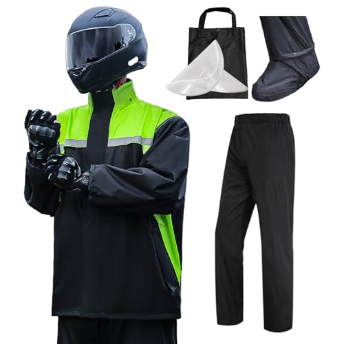 三和雨のメンズレインコートは高防水で透湿性あり。バイクや自転車での使用に最適。反射シート付きで安全性アップ。収納袋、靴カバーも付属し、通勤通学に便利な上下セット。
