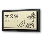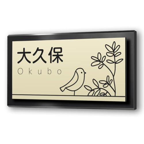Anvisのデザイン表札は、貼るだけで簡単に設置できます。防水仕様で屋外にも適し、両面テープ付きです。アイボリーと黒文字の組み合わせが特徴で、日本製のアクリルとステンレスを使用。サイズは210×110mmです。