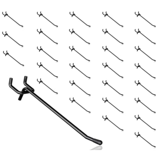 有孔ボード用のパンチングボードフックセットです。T型フックとゴム付きの全18種類を含み、穴のピッチは25mm、穴径は5mm。黒色での仕様、30個セット、長さは20cm。商品展示や壁面収納に最適です。