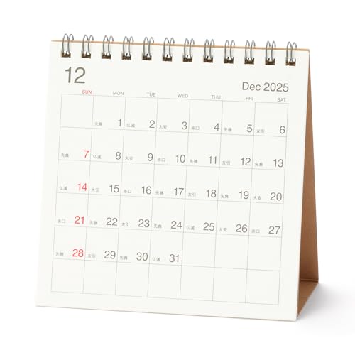 無印良品の2026年バガス入りペーパー日曜始まり六輝カレンダー・小は、2025年12月から2026年12月まで使用可能で、約120×120mmの卓上用サイズです。環境に配慮した素材で、シンプルなデザインが特徴です。