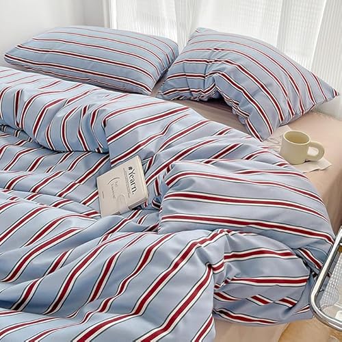 「§zz.luxi」布団カバーセット ダブル 4点セット ins ストライプ シンプル 寝具カバー 洋式・和式兼用 ベッドカバー 掛け布団カバー 韓国 ボックスシーツ 枕カバー シーツカバー 肌に優しい ピーチスキン加工 北欧風 オールシーズン(レッドブルー ダブル 4点セット)