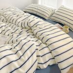 「§zz.luxi」布団カバーセット ダブル 4点セット。シンプルなストライプデザインで、洋式・和式兼用。肌に優しいピーチスキン加工の北欧風寝具。ネイビーパープル色でオールシーズン使用可能。