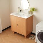 幅75cmの片開きタイプの洗面化粧台。シンプルでオシャレなデザインが特長。省スペース設計で収納力も抜群、簡単組立が可能。木目調の仕上げで、洗面所をおしゃれに演出します。