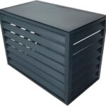 アルミ製のエアコン外枠保護カバー。取り外し可能で、バルコニーやガーデンに最適なルーバー付き植物棚。カラーはグレーで、耐久性に優れています。