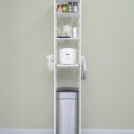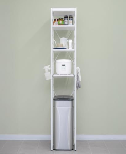 ottostyle.jpのキッチンラックは、スリムデザインのゴミ箱上にレンジ台と収納機能を備えています。電子レンジや炊飯器を置けるスライド棚、可動棚、サイドハンガー付きで、幅32cmのホワイト×ホワイトフレーム仕様です。