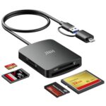 JNH 4in1カードリーダーは、USB 3.2 Gen1対応で、SD/TF(Micro SD)、メモリースティック、CF(TypeI)カードを同時に読み書き可能です。Type-CとUSB-Aに対応。