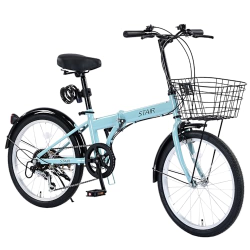 折りたたみ自転車で、シマノ6段変速搭載。20インチの小径車は通勤・通学に最適。カゴ、ワイヤーロック、前後泥除け付き。選べる7色、ライトブルーもあり。