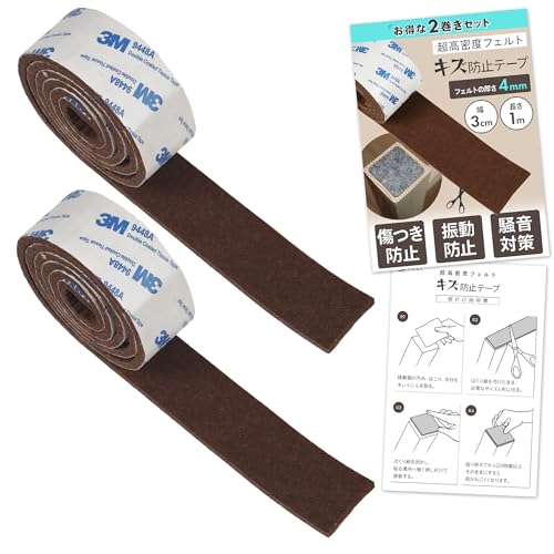 ふかふか厚フェルトの床保護テープ。傷防止や騒音対策に最適。簡単にカット可能で、椅子やテーブル、ソファなどの家具に使えます。サイズはブラウン色で幅3cm、長さ1mの2巻セットです。
