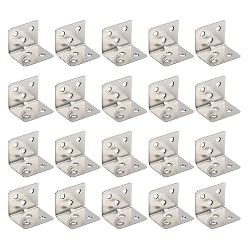 高耐久メタルコーナーブレースは、L字型のステンレススチール製ブラケットで、棚の補強に最適です。シルバーカラーが美しく、20個入りのセットで家具金具として幅広く使用できます。