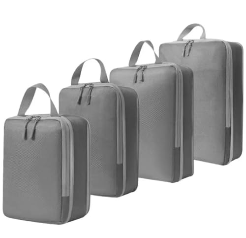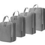 2025年最新の旅行用圧縮袋トラベルポーチ4点セット。安価で衣類仕分け、防水・防塵機能付き。出張や旅行、収納に最適なパッキングオーガナイザー。カラーはグレー。