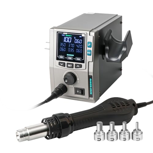 SUGON 2026 ヒートガンリワークステーションは700Wのパワーで、温度は100-500℃まで調整可能。ノズル4種、温度メモリ×3、自動冷却機能、静音設計を搭載し、基板予熱モードもあり、スマホ分解や電子部品修理に最適です。