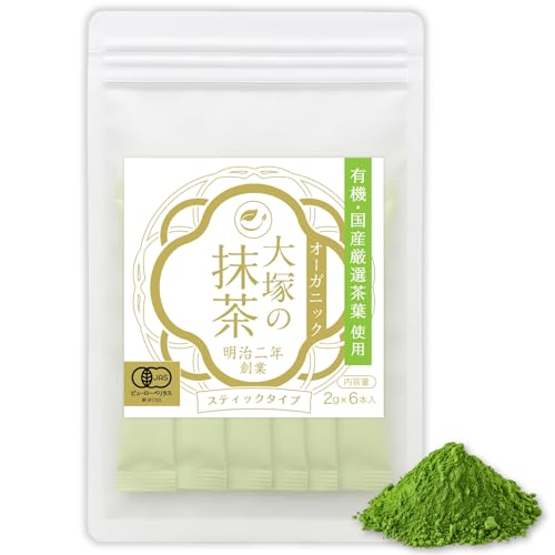 有機抹茶スティックは、高級オーガニック国産抹茶を使用し、明治二年創業の大塚製茶が製造。スティック2g×6本の個包装で、無添加・無農薬。手軽に本格的な抹茶を楽しめます。