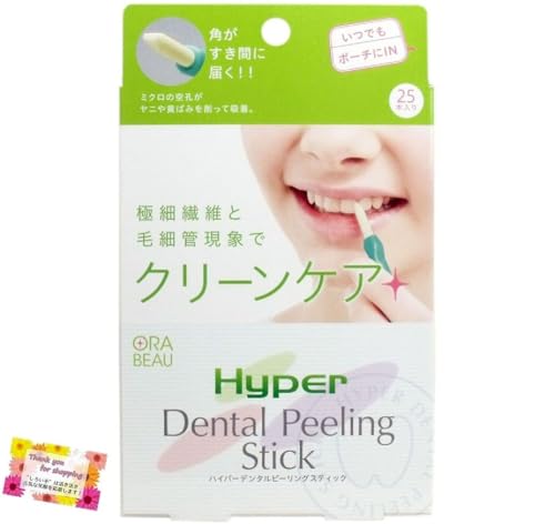 ハイパーデンタルピーリングスティックは、極細繊維が歯のすき間に届き、ヤニや黄ばみをしっかり除去。毛細管現象を利用したクリーンケアが可能。専用ハンドル付きで使いやすく、25本入りでコスパも良好。