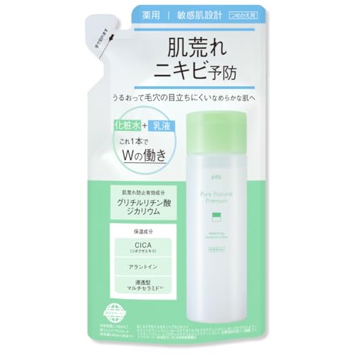 ピュア ナチュラル プレミアム バランシング エッセンスローションは、医薬部外品でニキビ予防、肌荒れ防止に効果的。抗炎症成分CICAやセラミドを配合し、滑らかで健康的な肌へ導きます。140mLの詰め替え用。