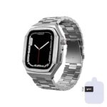 Apple Watchとの互換性あり。シリーズ9/8/7/6/5/4・SE第2世代/第1世代に適合。サイズは45mm/44mm/41mm/40mm。ステンレスケース、カバー、シリコンバンドがセット。液晶保護フィルム付き。カラー:シルバー。並行輸入品。