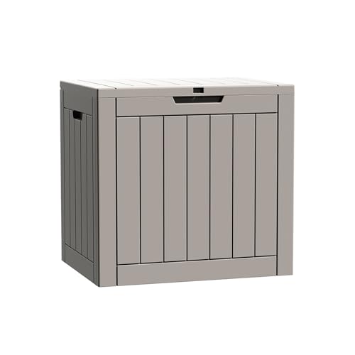 ハルミの大型屋外収納庫は118Lの防水・耐候性を持ち、サイズは幅56.1cm、奥行43.4cm、高さ53cmです。ベランダ、庭、ガレージに最適な薄茶色のおしゃれなストッカーです。