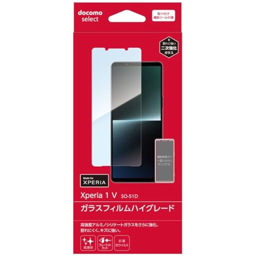 ドコモ純正 Xperia 1 IV SO-51D 用ガラスフィルム。ブルーライトカット機能付きで高光沢。ハイグレードな抗菌・抗ウイルス仕様で、かんたんに貼り付けられます。