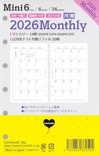 ラブリーフの2026年ミニ6穴システム手帳リフィル。2025年12月始まりのマンスリー月間ブロックとLOVEドット方眼SDM6002がセット。使いやすく、計画的な生活をサポートします。