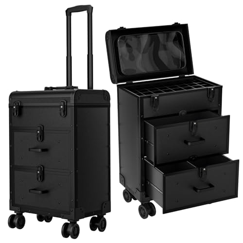 ホイール付きのプロフェッショナルなコスメトロリーケース。回転ホイール、スライド引き出し、鍵付き。美容師やネイルテクニシャンの必需品。ブラックカラーでスタイリッシュ。