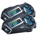 バイクインカムはOLEDディスプレイ搭載で3人接続、2人同時通話可能。通話距離1000M、Bluetooth 5.4対応。CVC8.0ノイズキャンセリング、IP67防水、FMラジオ付き。2台セット、技適認証済み。