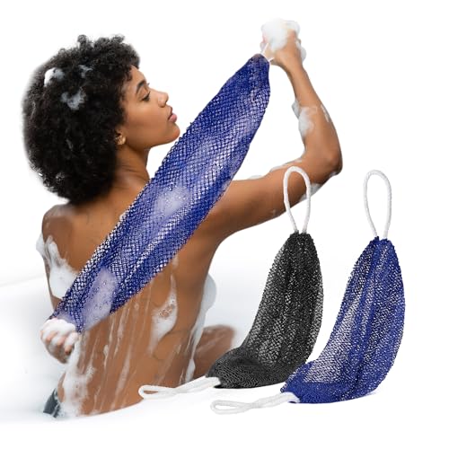 本物のアフリカン角質除去ネットスポンジ2個セット。結び目付きで長さ45インチ。急速乾燥、シャワーやバスに最適なボディケアアイテム。日常使用で肌を滑らかに。