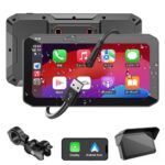 バイクスマートモニター 6.25インチは、Carplay/Android Auto対応の強化アルミホルダ付き。飛散防止IPS液晶タッチスクリーン、IPX65防水・防塵、耐熱・耐衝撃性。音声アシスタント・音楽再生・通話・ナビ機能を備えています。