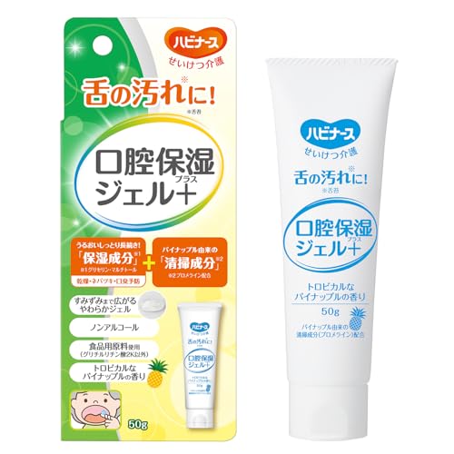ハビナース口腔保湿ジェルプラスは、トロピカルなパイナップルの香りで、清掃成分プロメラインを配合。口内環境を整え、口腔内の乾燥や口臭を予防します。50g入り。