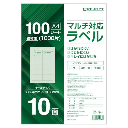 CREJOYTのラベルシールA4サイズは、10面で各86.4×50.8mm。100枚入りの強粘着タイプで、インクジェットとレーザープリンタ対応。白無地の上質紙で、宛名シールやタックシールに最適。手書きも可能です。