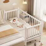SwiftLinkベビーベッドは、添い寝用のサイドベッドで、高さ調整が可能。三面ガード付きで安全性抜群、無塗装・無臭の炭鉱製。耐荷重100kg、北欧風のデザインで子供部屋に最適。サイズは180cm×40cm。